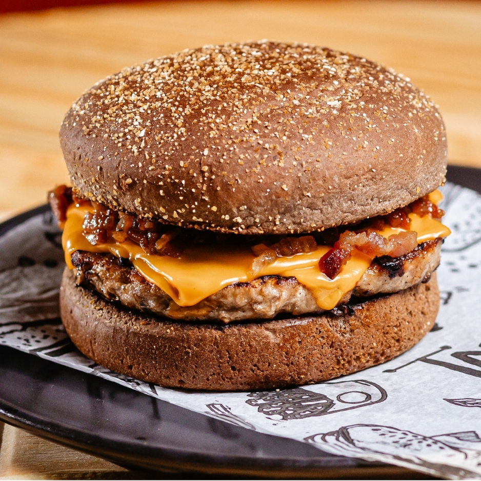 HAMBÚRGUER DE PERNIL 130GR, QUEIJO CHEDDAR, BACON, ABACAXI COM PIMENTA, BARBECUE E MAIONESE