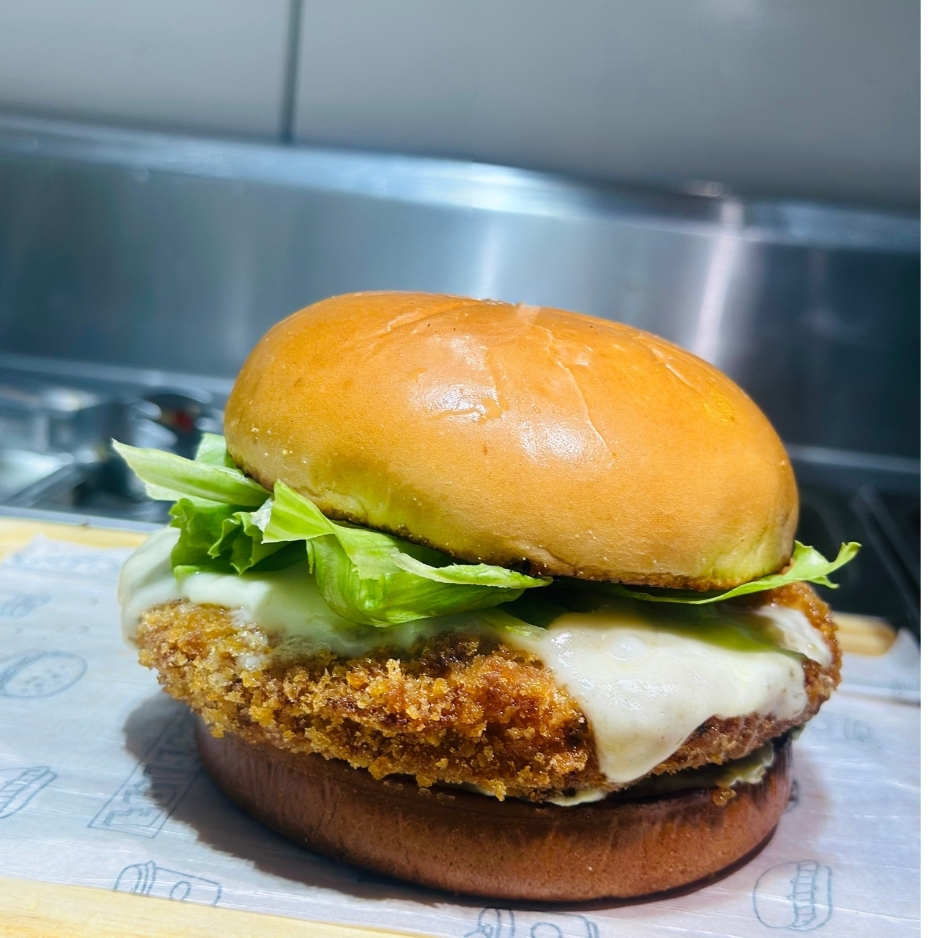 HAMBÚRGUER FRANGO EMPANADO NA PANKO 130GR, CREAM CHEESE, QUEIJO MUSSARELA, PATÊ DE AZEITONAS, ALFACE AMERICANO E MOSTARDA COM MEL