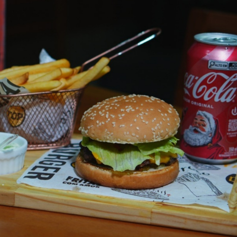 Pão brioche com gergelim, smash 80g, queijo cheddar, picles agridoce, alface americana, ketchup e molho billyjack, batata 100g e refrigerante coca cola lata 350 ml
