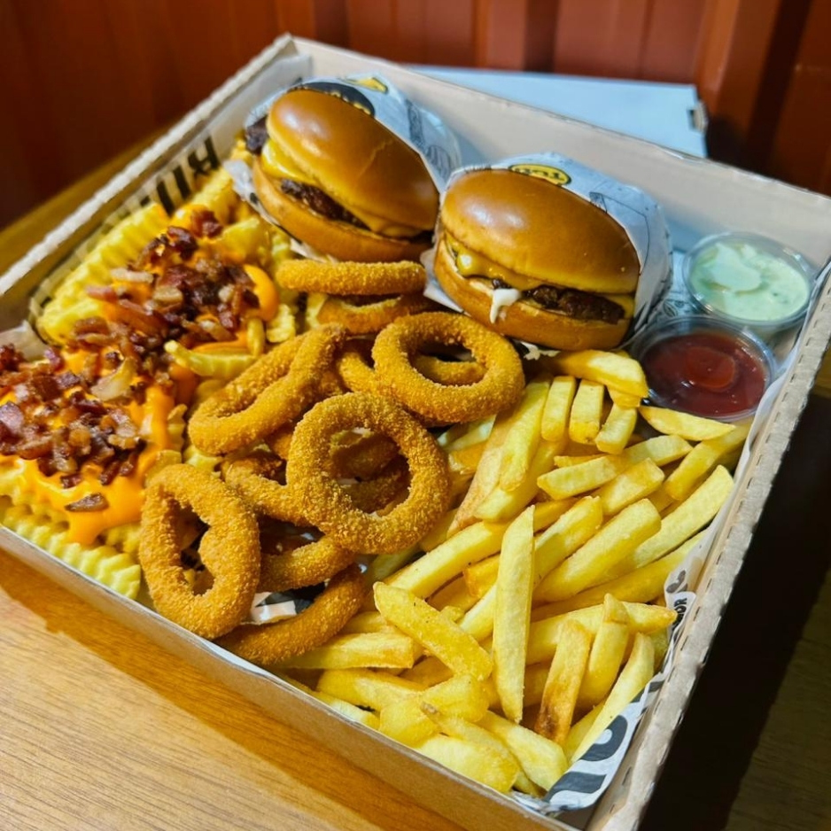 02 SMASH BURGUER (80G) 200G BATATA PALITO, 200G BATATA RUSTICA, 200G CEBOLA EM ANEIS, CHEDDAR E BACON EM UMA DAS PORCOES, MOLHOS - OBS NAO FAZEMOS TROCAS DE ITENS