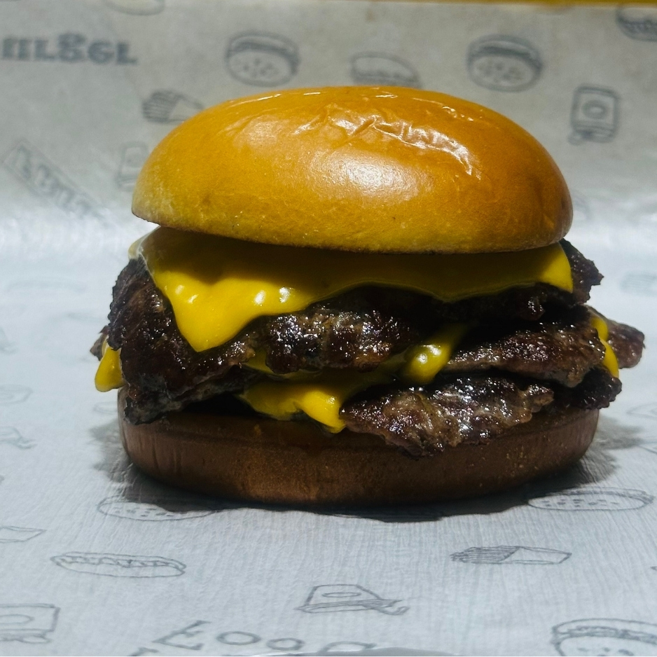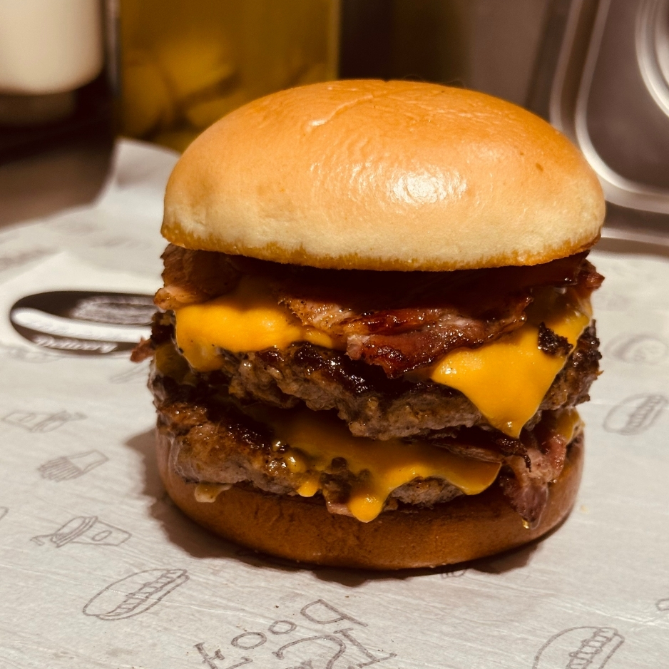 02 HAMBURGUERES BLEND 130 GR CADA, DOBRO TIRAS DE BACON, DOBRO QUEIJO CHEDDAR, MAIONESE E KETCHUP