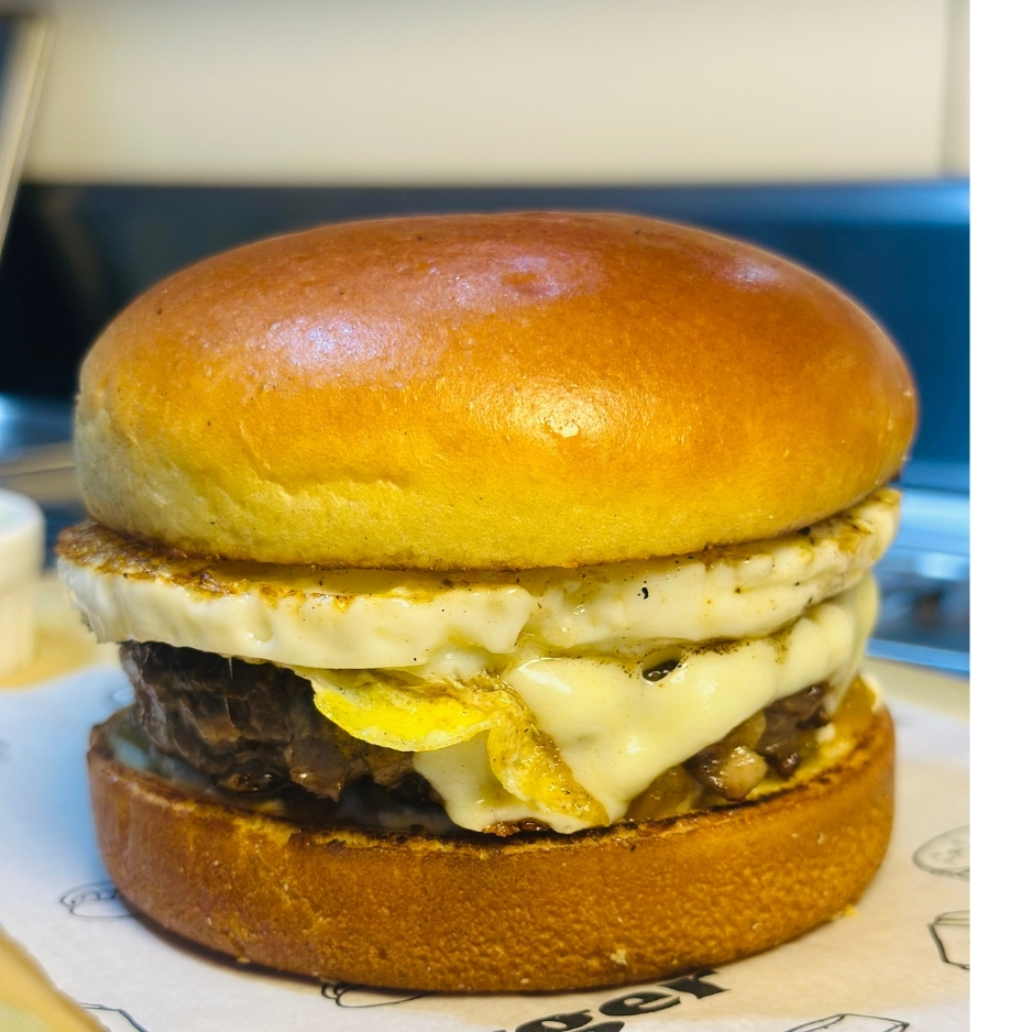HAMBÚRGUER DE COSTELA 130 GR, OVO,QUEIJO MUSSARELA, BACON,CEBOLA TOSTADA, MAIONESE DE ALHO E MOSTARDA