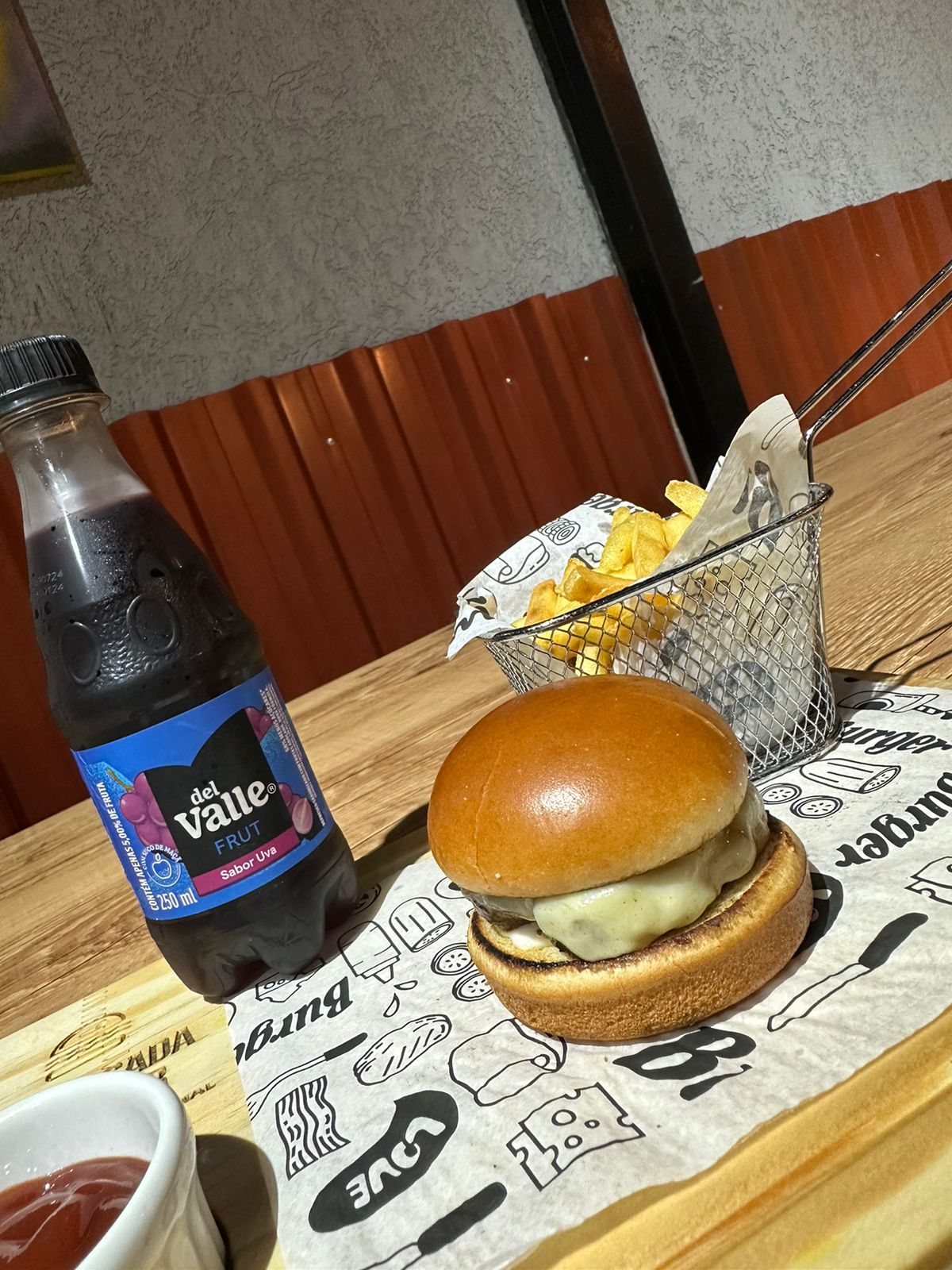 HAMBÚRGUER BLEND 130GR, QUEIJO CHEDDAR, MAIONESE E KETCHUP, PORÇÃO FRITAS 100GR, CAÇULINHA 200ML, DANONINHO