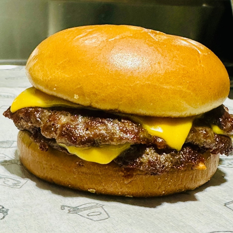 PÃO BRIOCHE, DUPLO HAMBÚRGUER 80G (CADA), QUEIJO CHEDDAR, MAIONESE E KETCHUP
